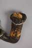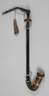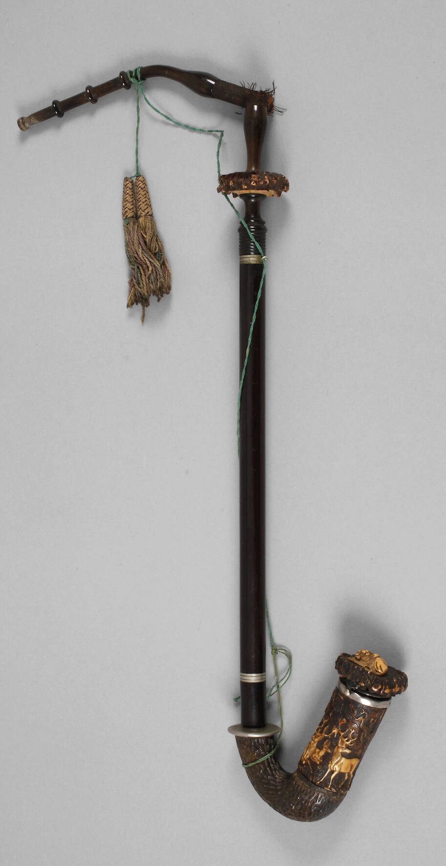 Wilhelm Lebrecht Schulz attr. (1774-1863 Meiningen), Mitte 19. Jh., Pfeifenkopf aus Hirschhorn, mehrteilig gearbeitet und gesteckt, verziert von reliefiertem Rotwildmotiv, vernickelte Montierungen, gedrechseltes Gestänge aus Hartholz, textile Abhängungen, Mundstück gebrochen, etwas restaurierungsbedürftig, L ca. 51 cm.
