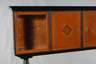 Darmstadt, um 1905, dreiteiliger Korpus, Platanenholz und Perlahorn furniert, Birnbaumholz, schwarz gebeizt, intarsiert mit verschiedenen Hölzern und Perlmutt, Aufsatz mit intarsiertem geometrischen Ornament, die Tür mit Stangenschloss, von Flammleisten gerahmt, seitlich Furnierfehlstellen, Alters- und Gebrauchsspuren, rest.bed., Maße 165 x 175 x 45 cm. Quelle: vgl. Museum Künstlerkolonie Darmstadt, 1989, S. 194-195 und Ausstellungskatalog Landesmuseum Oldenburg.
