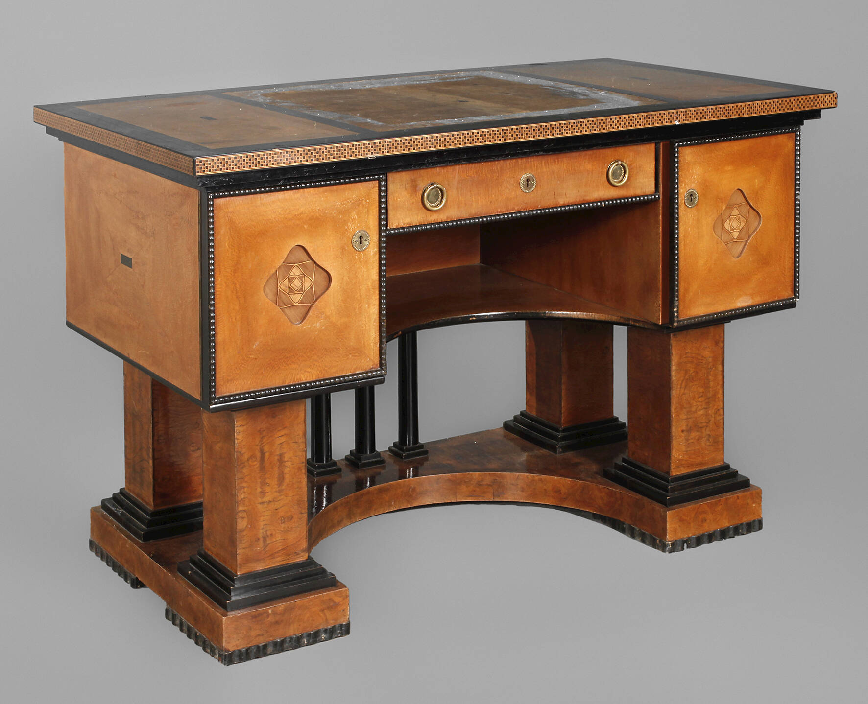 Darmstadt, um 1905, Platanenholz und Perlahorn furniert, Birnbaumholz, schwarz gebeizt, intarsiert mit verschiedenen Hölzern und Perlmutt, frei im Raum stellbarer Schreibtisch, Platte umlaufend mit feinen Bandeinlagen, darunter zwei Türen und Schubkasten, von schwarzen Flammleisten gerahmt, getragen von vier quadratischen Säulen, auf gebogter Grundplatte montiert, Oberfläche mit Alters- und Gebrauchsspuren, Ledereinlage der Platte fehlt, rest.bed., Maße 75 x 120 x 64 cm. Quelle: vgl. Museum Künstlerkolonie Darmstadt, 1989, S. 194-195 und Ausstellungskatalog Landesmuseum Oldenburg.