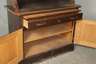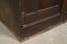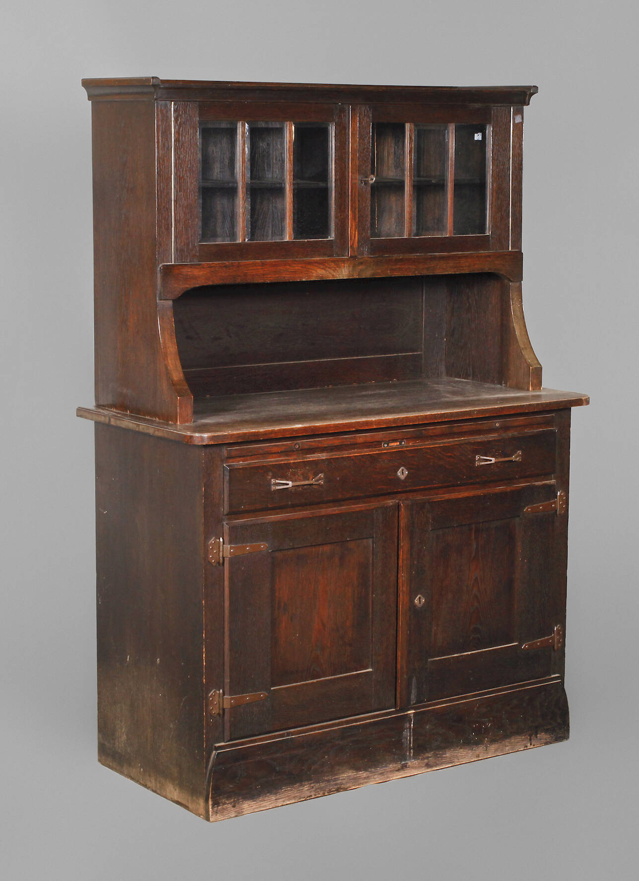 um 1905, Eiche massiv und furniert, aus der Speisezimmereinrichtung III, dunkelbraun gebeizt, Ausführung Vereinigte Werkstätten Dresden Hellerau, zweiteiliger Korpus, originale Eisenbeschläge, ein Schlüsselbeschlag sowie die Handhaben der Auszugplatte fehlen, zwei Scheiben ergänzt, Alters- und Gebrauchsspuren, Maße 168 x 120 x 53 cm. Quelle: Richard Riemerschmid, Vom Jugendstil zum Werkbund, Münchner Stadtmuseum 1983, S. 204.
