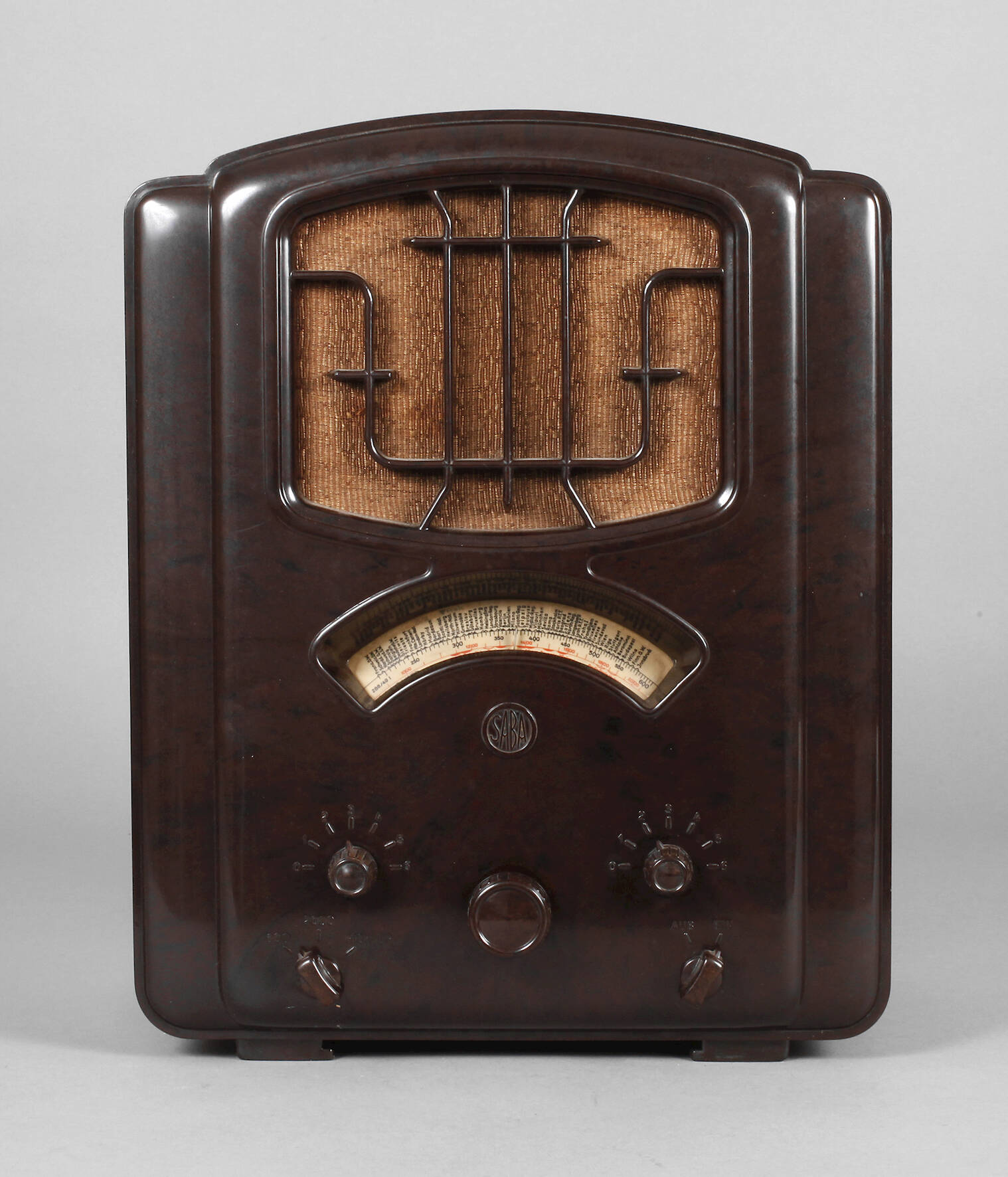 1930er Jahre, gemarkt SABA, Seriennummer 83734C, hochrechteckiges Bakelitgehäuse, die Front mit textil hinterlegter Lautsprecheröffnung, Drehskala sowie vier zusätzliche Regler, gute Erhaltung, ohne Verkabelung, Maße 40 x 34 x 20 cm.