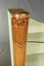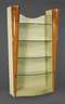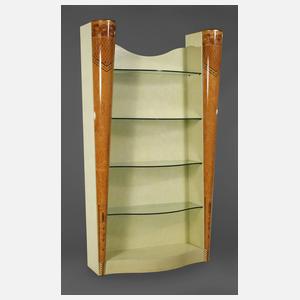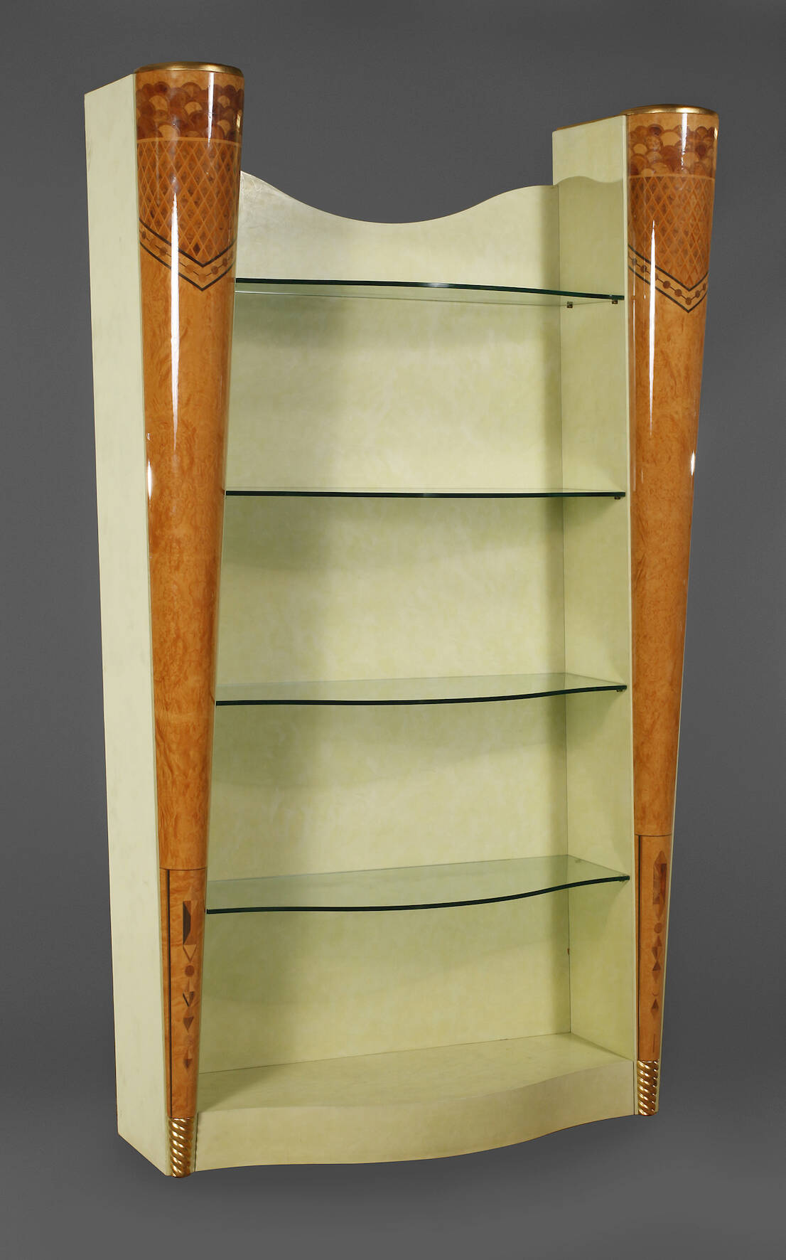 Italien, 1980er Jahre, MDF Platten hellgrün lackiert, die konisch zulaufenden Lisenen in Rüsterwurzel furniert, geometrische Einlegearbeiten in verschiedenen Edelhölzern, vergoldete Kapitelle und Basen, originale, geschweifte Glaseinlegeböden, Maße 218 x 130 x 40 cm. Info: Colombostile wurde 1886 in Meda im Herzen von Brianza gegründet, wo die Holz- und Möbelindustrie bereits von Europa bis in die USA bekannt und geschätzt war. Das Unternehmen wurde 1973 gegründet und entwickelte sich zu einem führenden Unternehmen im Möbeleinrichtungssektor. Quelle: Internet.