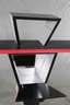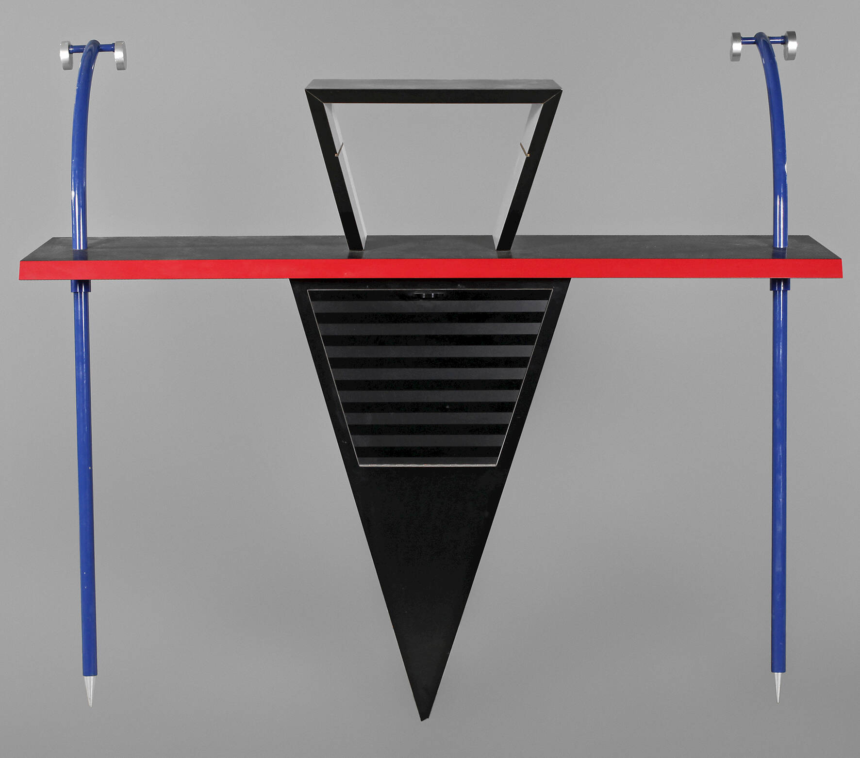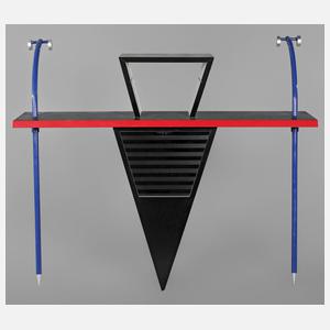 1980er Jahre, Stahl blau lackiert, MDF-Platte mit Aluminium beschichtet und schwarz eloxiert, Holz schwarz lackiert, das pyramidenförmige Mittelteil mit Klappe, darüber aufgesteckter Aufsatz (Regalboden fehlt), sonst guter Zustand, Maße 155 x 180 x 60 cm.
