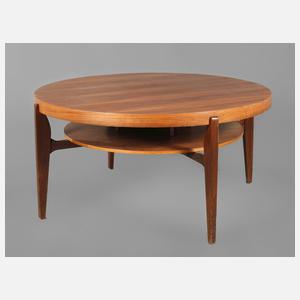 1960er Jahre, runde in Nussbaum furnierte Platte mit darunter liegender Ablage, Füße aus massiver Buche dunkelbraun gebeizt, guter Zustand, H 54 cm, D 105 cm.