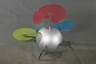 1980er Jahre, ungemarkt, kugelförmiger Korpus aus silberbronziertem Metall, auf vier verchromten Füßen, vier verschiedenfarbige Glasplatten in unterschiedlichen Formen, normale Altersspuren, H 58 cm, D 97 cm.
