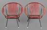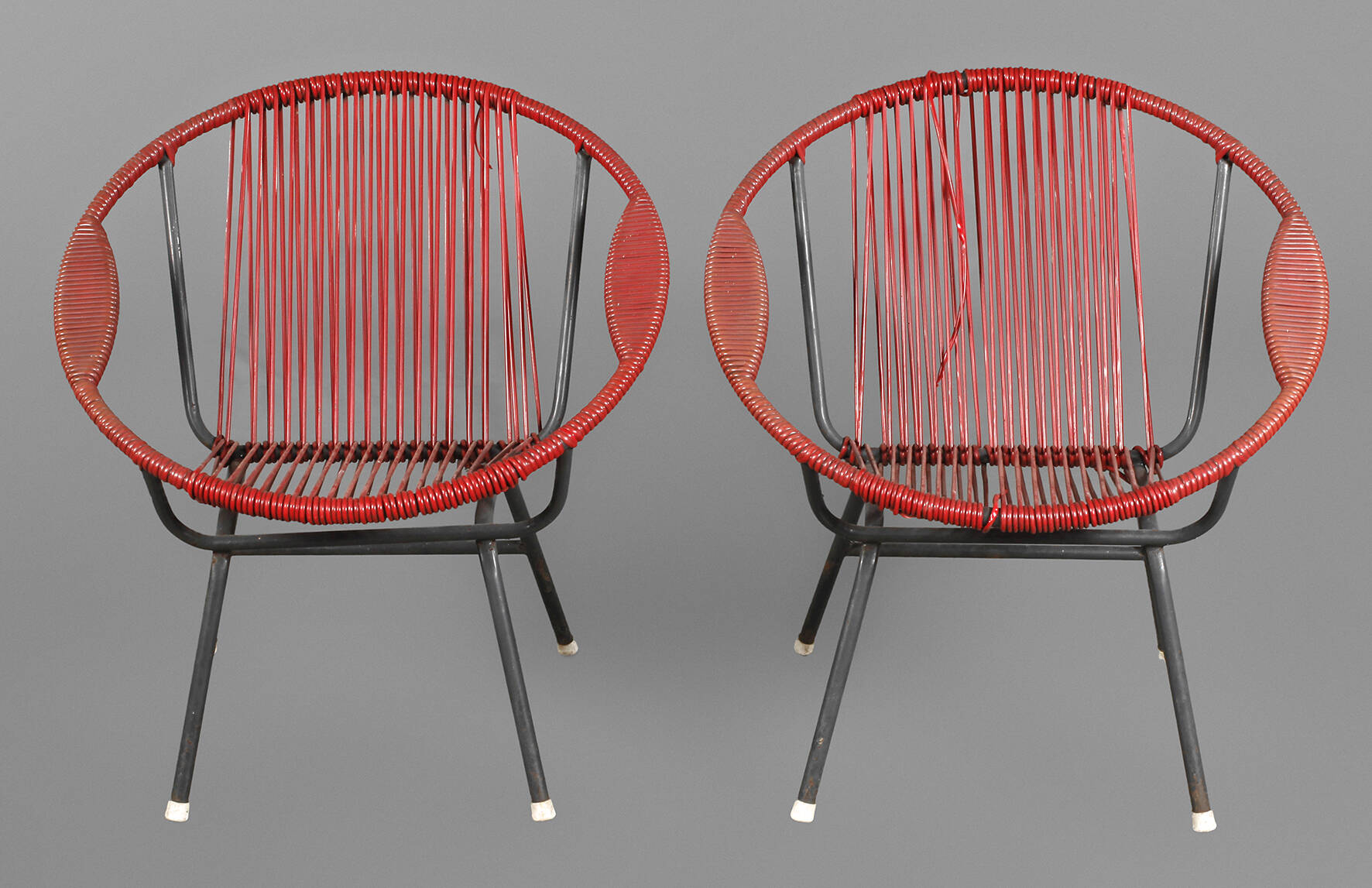1960er Jahre, schwarz lackiertes Eisengestell, originale Bespannung aus Kunststoff, an einer Stelle gerissen, Alters- und Gebrauchsspuren, H je 70 cm, D je 63 cm.