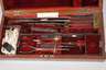 um 1840, mehrfach gemarkt Weiss London, innen mit handschriftlichem Klebezettel mit undeutlicher Besitzerangabe „personal property of his ...I. E. Skardon?“, langrechteckige Nussbaumschatulle mit Messingmontierungen, das Innenleben mit rotem Samt ausgekleidet, mit mehreren Beilagen und zahlreichem medizinischen Utensil, teils stärkere Alters- und Gebrauchsspuren, L Etui 40 cm.