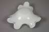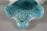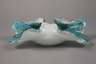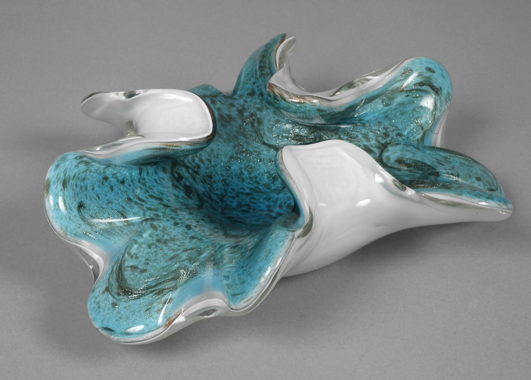 2. Hälfte 20. Jh., ungemarkt, massives, farbloses, leicht blasiges Glas, plangeschliffener Stand, türkisfarben und weiß unterfangen, eingeschmolzene silberschimmernde Krösel, stark gekniffen, guter Zustand, D 26 cm.