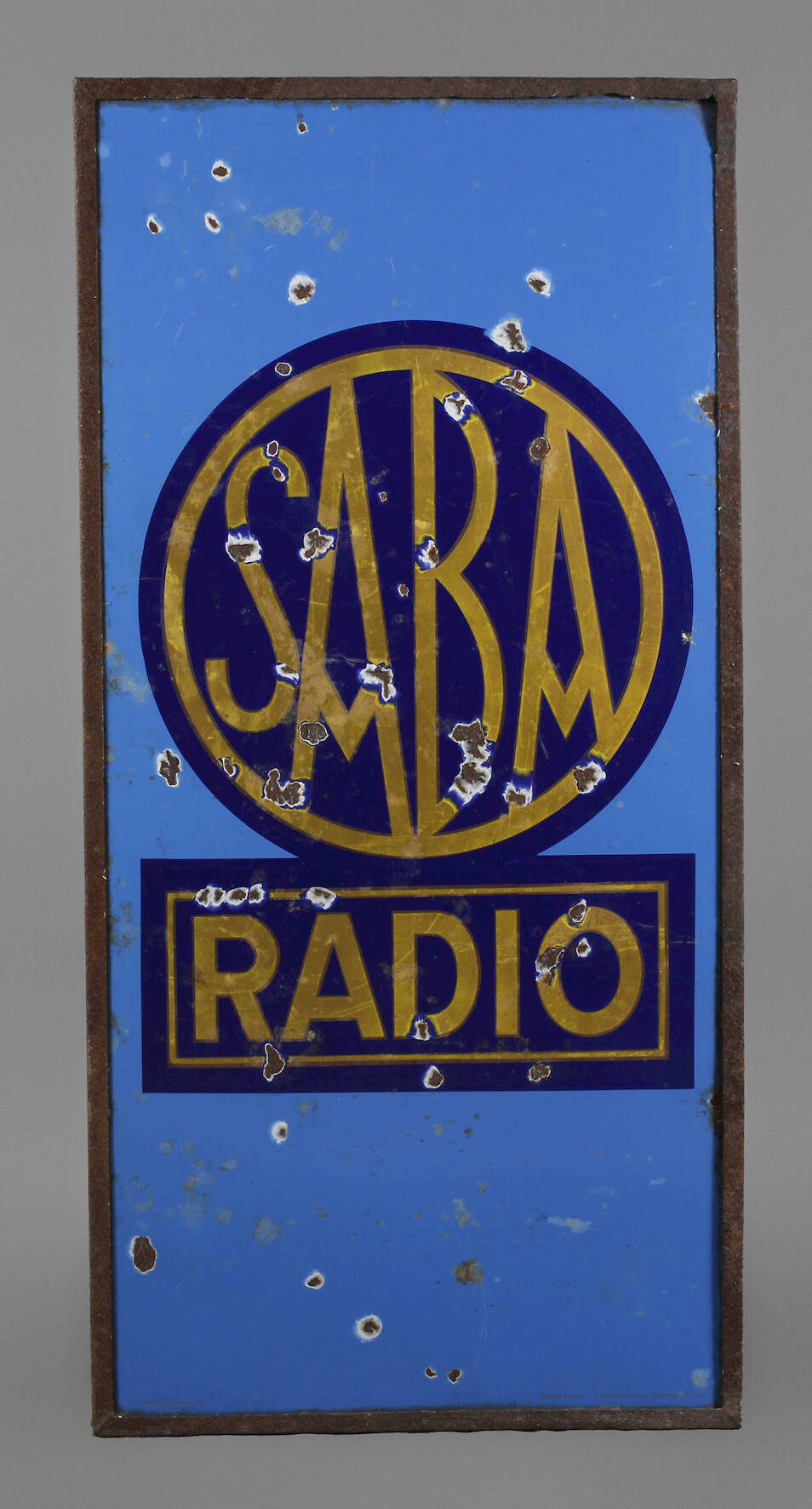 1930er Jahre, gemarkt Ferro-Email C. Robert Dold, hochrechteckiges, flaches, zart geprägtes Schild, dreifarbig emailliert, mit Firmenlogo, in eiserne Leiste gefasst, stärkere Erhaltungsmängel, Z 3-, Maße 120 x 58 cm.