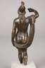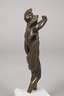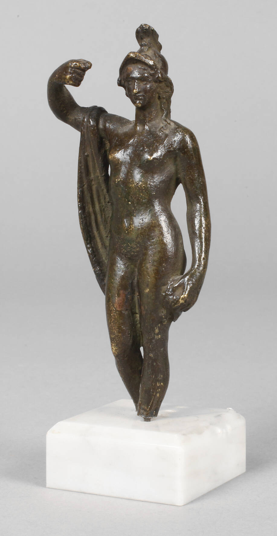 undatiert und ohne Analyse, wohl frühe Neuzeit, eine sehr gelbliche Bronze mit intakter Patina, die Füße fehlen, auf Steinsockel montiert, H der figürlichen Bronze ca. 12,7 cm.