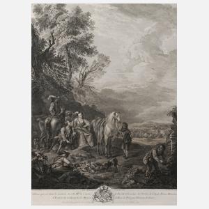 Jagdgesellschaft am Waldesrand bei einem Brunnen mit ausgebreiteten erlegten Tieren im Vordergrund, nach einer Vorlage von Carel van Falens, unter der Darstellung betitelt "Le chasseur fortuné" und ausführlich bezeichnet und datiert "... 1745", Kupferstich, unter der Darstellung, in der Platte rechts signiert "Jac. Ph. Le Bas Sculp." und links "C Van Falens pinxit", außerhalb der Darstellung brauner Fleck, hinter Glas gerahmt, Darstellungsmaße ohne Schrift ca. 51,5 x 40 cm. Künstlerinfo: auch Le Bas, frz. Kupferstecher und Verleger (1707 Paris bis 1783 Paris), Schüler von Antoine Hérisset in Paris, später bei Nicolas Tardieu, gefördert von Crozat, 1743 Mitglied der Pariser Akademie, 1744 zum königlichen Hofkupferstecher ernannt, gilt als bedeutender Lehrer der besten französischen Kupferstecher der 2. Hälfte des 18. Jh., tätig in Paris, Quelle: Thieme-Becker und Wikipedia.