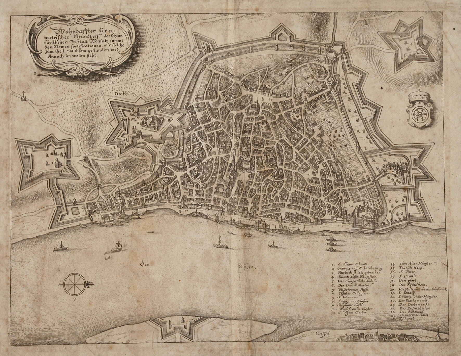 links oben Kartusche und hierin bezeichnet "Wahrhaffter Geometrischer Grundtriss der Churfürstlichen Statt Maintz sampt den Newen Fortificationen ...", Grundriss der Stadt am Rhein mit ihren Befestigungsanlagen, rechts unten Legende, Kupferstich, um 1650, Erhaltungsmängel, Darstellungsmaße ca. 26,5 x 35 cm, Blattmaße ca. 34 x 40 cm. Künstlerinfo: schweizerischer Kupferstecher, Buchhändler und Verleger (1593 Basel bis 1650 Schwalbach), 1606–09 Schüler des Kupferstechers Dietrich Meyer und des Glasmalers Christof Murer in Zürich, 1610 bei Friedrich Brentel in Straßburg, 1625 Übernahme der Kunsthandlung seines Schwiegervaters Johann Theodor de Bry in Frankfurt am Main, nach seinem Tod führten seine Söhne Matthäus der Jüngere und Caspar sowie später deren Nachkommen den Verlag unter der Bezeichnung ”Merians Erben” bis 1727 weiter und vervollständigten seine Hauptwerke ”Topographia Germaniae” und ”Theatrum Europaeum”, Quelle: Thieme-Becker und Internet.