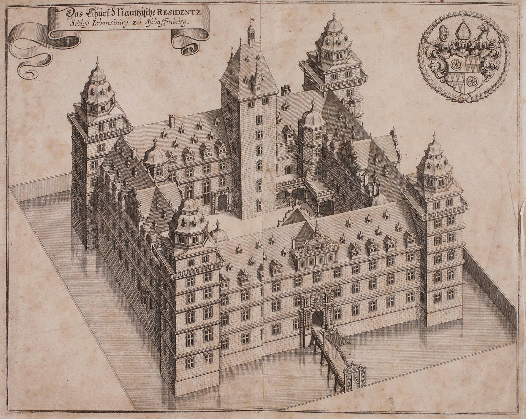 Blick aus der Vogelschau auf das von einem Wassergraben umgebene Schloss Johannisburg in Aschaffenburg, aus "Topographia Archiepiscopatuvm Moguntinensis ...", Kupferstich, um 1650, mittig übliche Faltlinie, etwas fleckig, auf Unterlagekarton montiert, Darstellungsmaße ca. 25,5 x 32 cm, Blattmaße ca. 27 x 36 cm. Künstlerinfo: schweizerischer Kupferstecher, Buchhändler und Verleger (1593 Basel bis 1650 Schwalbach), 1606–09 Schüler des Kupferstechers Dietrich Meyer und des Glasmalers Christof Murer in Zürich, 1610 bei Friedrich Brentel in Straßburg, 1625 Übernahme der Kunsthandlung seines Schwiegervaters Johann Theodor de Bry in Frankfurt am Main, nach seinem Tod führten seine Söhne Matthäus der Jüngere und Caspar sowie später deren Nachkommen den Verlag unter der Bezeichnung ”Merians Erben” bis 1727 weiter und vervollständigten seine Hauptwerke ”Topographia Germaniae” und ”Theatrum Europaeum”, Quelle: Thieme-Becker und Internet.