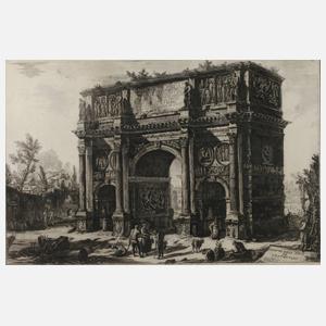 Darstellung des ruinösen, im Jahr 315 eingeweihten Konstantinsbogen, mit Personen und Ziegen im Vordergrund, Radierung, nach 1767, späterer Abzug, in der Platte unten links bezeichnet "Cavaliere Piranesi del. ed inc.", oben rechts in der Platte die Nummern "777" und "25" sowie rechts unten Prägestempel, hinter Glas gerahmt, Darstellungsmaße ca. 47 x 71 cm. Künstlerinfo: bedeut. italienischer Kupferstecher, Zeichner, Archäologe, Verleger, Architekt und Architekturtheoretiker (1720 Mogliano Veneto bei Treviso bis 1778 Rom), Ausbildung als Architekt am Magistrato delle Acque bei seinem Onkel Matteo Lucchesi in Venedig, anschließend Ausbildung zum Bühnenbildner bei Giovanni Scalfarotto und Radierung und Perspektive bei Carlo Zucchi, 1740 Reise als Zeichner im Gefolge des venezianischen Gesandten beim Vatikan, Marco Foscarini, nach Rom, hier zunächst als Architekt tätig, aus wirtschaftlichen Gründen Hinwendung zur Malerei und zum Kupferstich, 1741 Schüler in Kupferstich und Radierung bei dem Vedutenzeichner Giuseppe Vasi, 1743 Veröffentlichung der erste Kupferstichvedutensammlung, 1743 über Neapel und die eben begonnenen Ausgrabungen von Pompeji Rückreise nach Venedig, 1743–47 Aufenthalt bei Giovanni Battista Tiepolo in Venedig, 1748 wieder in Rom und schuf bis 1774 weitere Folgen von Veduten barocker und antiker Baudenkmäler, gefördert von Papst Benedikt XIV., 1757 Aufnahme in die Londoner Gesellschaft für Altertumsforscher, 1761 Gründung des eigenen Verlags und Aufnahme in die Accademia di San Luca, 1763 Auftrag von Papst Clemens XIII. zum Umbau des Chores von San Giovanni in Laterano, 1764 durch Kardinal Giovanni Battista Rezzonico mit der Neugestaltung von Santa Maria del Priorato beauftragt, 1767 durch Clemens XIII. zum Ritter ernannt, signierte seine Werke fortan mit "Cavalier Piranesi F.", Quelle: Thieme-Becker und Internet.