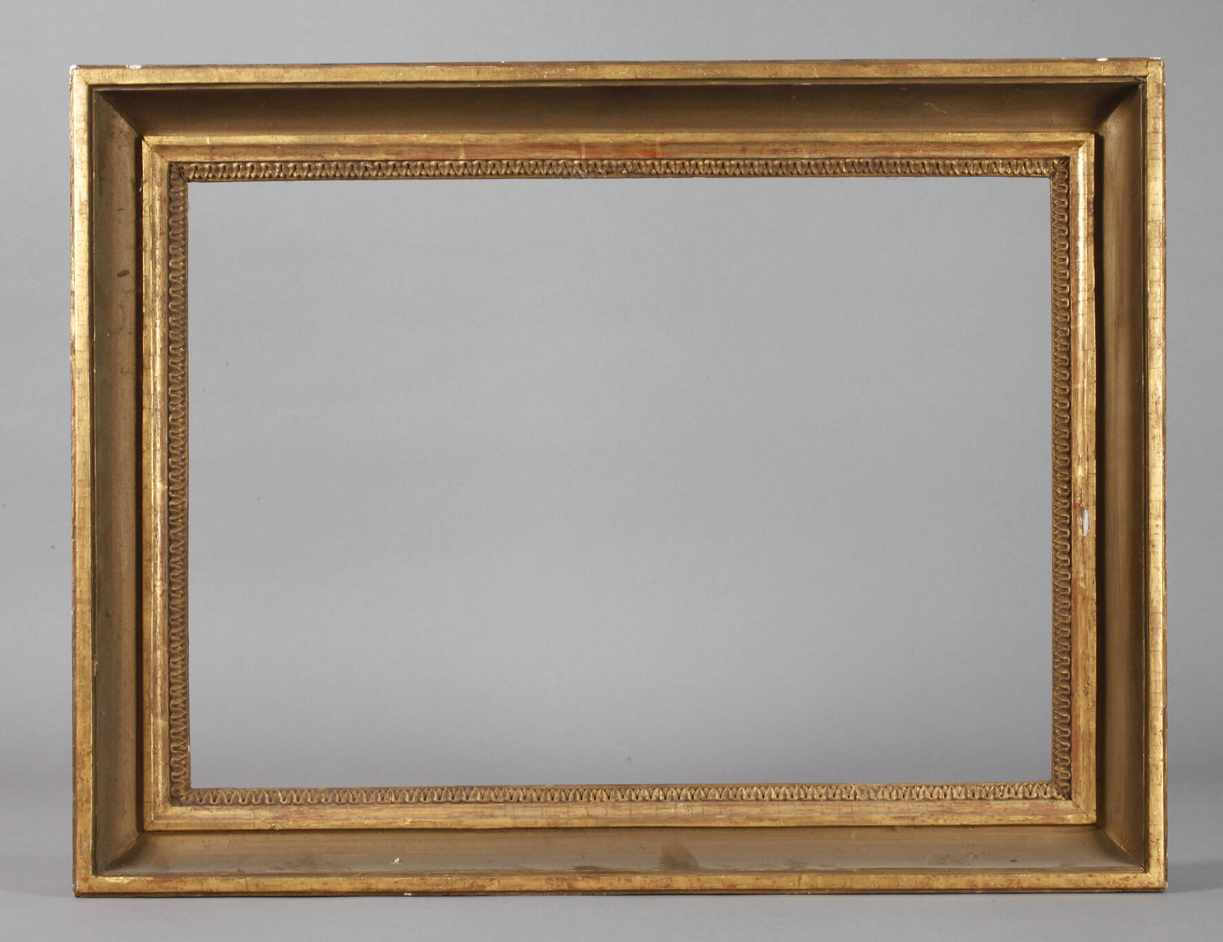 1. Hälfte 19. Jh., ca. 8 cm breite, steigend profilierte goldbronzierte Leiste in zurückhaltendem Dekor, kleinste Substanzverluste, Altersspuren, Falzmaße ca. 60 x 42 cm.