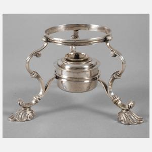 datiert 1771, Meisterpunze MT, unleserlicher Beschaumeister, aus massivem Silber, dreiteilig mit Fuß, Brenner und Deckel, dreipassig auf floral gestalteten Füßen, D 15 cm, G ca. 363 g.