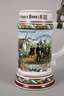 1902/04, aus der Zeit, als das Regiment von Leipzig nach Plauen verlegt wurde, bezeichnet: "9. Comp. Kgl. Sächs. 10. Inf.-Rgt. Nr. 134 Leipzig u. Plauen i. V.", Namensangabe: "Fritz Riedel", schauseitig Umdruckdekor mit Ansicht der Garnisonsstadt Plauen hinter Bildnis des Obersten Heimbach, rückseitig zwei Namensleisten, hoher Zinndeckel, vor allem zu nennen die gestaltete Rückseite des Drückers, in der Bodenlithophanie mit Abschiedsszene leider eine Spinne, sonst normale Altersspuren, H ges. ca. 29,5 cm.