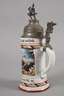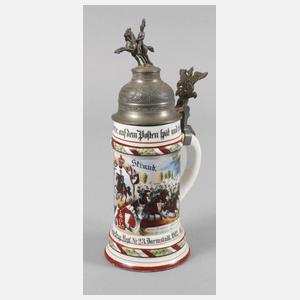 1902/05, Leib. Eskr. 1. Großh. Hess. Garde Drag. Regt. Nr. 23 Darmstadt, Porzellan mit Bodenlithophanie, Kavallerist zu Pferde im Angriff, bedruckt, bemalt und partiell weißgehöht, mit Abschieds- und Angriffsszenen, rückseitig Namensleisten, reliefierter Zinndeckel mit Schriftzug "Reserve hat Ruh" und vollplastischem Reiter in Uniform, Adler als Drücker, Deckel etwas verzogen, die Spruchbänder minimal berieben, Namensleisten gut lesbar, H 30 cm.