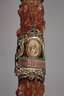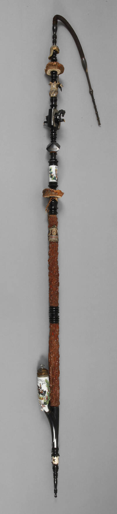 1903/06, 2. Esc. Regt. d. Gardes du Corps Potsdam, Porzellanpfeifenkopf mäßig bestoßen, Stock als Horn-Holz-System, Porzellanzwischenstück mit Bildnis des Kaisers gerissen, bei dem durch ein Hufeisen springenden Pferd fehlen die unteren Läufe, allgemeine Gebrauchsspuren, H max. ca. 162 cm.