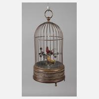 1. Hälfte 20. Jh., Gehäuse aus getriebenem Messingblech in Form eines Vogelbauers, darin zwei gefiederte Gesellen, integrierte Mechanik und Pfeifen funktionstüchtig, Altersspuren, etwas rest.bed., H ca. 30 cm.