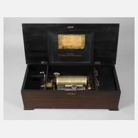 um 1890, langrechteckiges, auf Mahagoni gebeiztes Gehäuse, die Deckelinnenseite mit Händlervermerk Sol Agents E. F. Allen & Sons Wolverhampton sowie handschriftlicher Angabe der 20 spielbaren Melodien, verglastes Spielwerk mit massiver Walze, Seriennummer 4681, Spielwerk läuft, etwas reinig.bed., Alters- und Gebrauchsspuren, Maße 20 x 60 x 28 cm.
