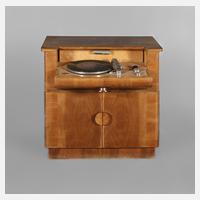 deutsch, 1930er Jahre, nussbaumfurnierter Korpus mit ausklappbarer Front, innen mit Vogelaugenahorn furniert und elektrisch beleuchtet, Grammophon mit Elektroantrieb, Altersspuren, Funktion nicht geprüft, dazu beigegeben 45 Platten, Maße 84 x 80 x 47 cm.
