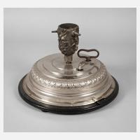 um 1920, geschwärzte Holzbasis, Aufsatz aus getriebenem Weißblech mit ornamentaler Verzierung, die Aufnahme aus Eisenguss mit drei Rädelschrauben, mit originalem Schlüssel, mehrere Melodien, funktionstüchtig, Alters- und Gebrauchsspuren, D ca. 40 cm.