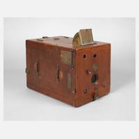 um 1895, Dr. Rudolf Krügener, Bockenheim (Frankfurt am Main), für Glasplatten im Format 9x12 cm, gemarkt Katalog No. 64, Anastigmat, Gehäuse mit Seriennummer 10971, Verkäuferschild "Ad. Fischl. Jr.", Nussbaumgehäuse mit Messingmontierungen, Altersspuren, L 23 cm.
