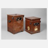 um 1900, einer gemarkt Stereo-Classeur Le Verascope Richard, im Nussbaum- bzw. Mahagonigehäuse mit Metallmontierungen, beide in fragmentarischer Erhaltung, restaurierungsbedürftig, H 35 und 29 cm.
