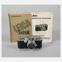 Mitte 20. Jh., mehrfach gemarkt Leica Ernst Leitz Wetzlar, Seriennummer 339820, lederummanteltes Metallgehäuse, Objektiv bezeichnet Summar f=5 cm 1:2, im originalen Lederetui, funktionstüchtig, beigegeben Gebrauchsanleitung sowie Fachbuch Leica-Technik von Curt Emmermann, leichte Alters- und Gebrauchsspuren.