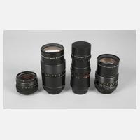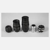 2. Hälfte 20. Jh., dabei Zeiss Tessar 2,8/50, Pentacon electric 1,8/50, zwei Weitwinkelobjektive Pentacon 2,8/135 und 4/200, dazu ein ungemarktes Objektivgehäuse, alle im originalen Lederetui, Alters- und Gebrauchsspuren.