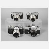 DDR, Mitte 20. Jh., dabei Pentacon FM, Objektiv gemarkt Tessar 2,8/50, zwei Altix mit identischem Objektiv sowie Praktica LTL 2, Objektiv gemarkt Domiplan 2,8/50, alle im Originaletui, Funktion nicht geprüft.