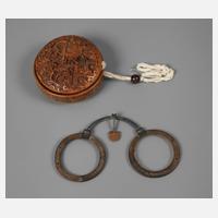 wohl China, 18. Jh., klappbares Gestell aus Messing und Horn, ohne Bügel, im originalen geschnitzten Etui, ein Glaseinsatz fehlt, D 7 cm, L 11 cm.
