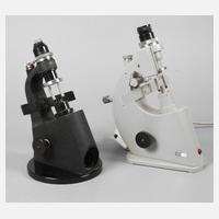 um 1970, Metallguss grau und schwarz gefasst, Scheitelbrechwertmesser, einer gemarkt Carl Zeiss Jena 6453, Geräte zur Bestimmung der Dioptrien und Prismendioptrien, Gebrauchsspuren, H 28 und 29 cm.