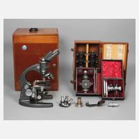 1. Hälfte 20. Jh., gemarkt C. Baker London, silbergrau gefasstes Gussgehäuse mit Dreifachrevolver und vernickelten Metallteilen, beigegeben zahlreiches Zubehör in drei Etuis, gute Erhaltung.