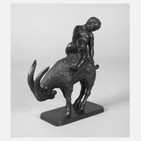 um 1920, unsigniert, am Boden zwei geprägte Gießermarken, Eisenguss geschwärzt, ein kleiner unbekleideter Knabe hat es sich auf dem Rücken eines Ziegenbocks gemütlich gemacht, gute Erhaltung, H 20 cm.