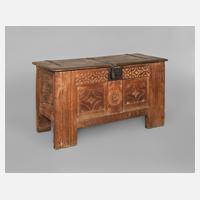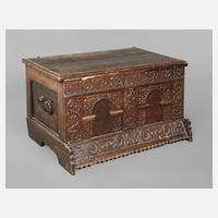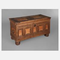 Eiche massiv, im Sockel datiert 1648, allseitig verziert mit geometrischer Oberflächenschnitzerei, originales Schloss, Beschläge und Schlüssel, innen mit kleiner Beilade, der mittlere Zierbeschlag wohl später ergänzt, stärkere Alters- und Gebrauchsspuren, Maße 82 x 139 x 58 cm.