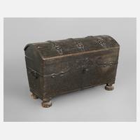 2. Hälfte 18. Jh., Eiche massiv, dunkel gebeizt, dekorative schmiedeeiserne Beschläge, originales Schloss und Schlüssel, innen mit Beilade, stärkere Alters- und Gebrauchsspuren, Maße 73 x 107 x 58 cm.