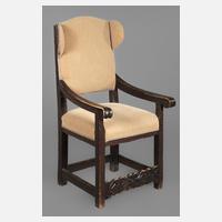 Buche massiv, dunkelbraun gebeizt, das Gestell allseitig mit feinem Schuppenmotiv verziert, leicht geschwungene Armlehnen mit Volutenabschluss, alt restauriert, Polster erneuert, partiell mit stärkeren Altersspuren, Maße 122 x 62 x 62 cm.