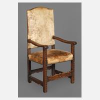 um 1700, Eiche massiv, dunkelbraun gebeizt, die Vorderbeine mit geschnitztem Schuppenmotiv, leicht geschwungene Armlehnen mit Volutenabschluss, pergamentfarbener Lederbezug erneuert, restauriert mit Ergänzungen, stabiler Zustand, Maße 125 x 62 x 57 cm.