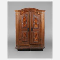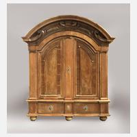1. Hälfte 18. Jh., aus dem Kloster Banz bei Lichtenfels, Franken, Nussbaum auf Eiche furniert, Eiche massiv, zweitüriger Hallenschrank, mit aufwendig gestaltetem, hohem bogenförmigen Gesims und breiten, tief gekehlten Profilleisten mit Volutenabschluss, die breiten Lisenen und Schlagleiste mit dorischen Kapitellen verziert, Tür mit originalem Messingschloss und drei Zuhaltungen, der doppelt gebauchte Sockel mit einem großen durchgehenden Schubkasten, Alters- und Gebrauchsspuren, kleinere Fehlstellen und Ergänzungen, rest.bed., Maße 285 x 231 x 78 cm. Provenienz: Der Schrank wurde vom Vorbesitzer in den 1970er Jahren im Kloster Banz erworben. Er diente bis dahin zur Aufbewahrung der Messgewänder.