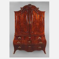 Holland, Ende 18. Jh., Mahagoni auf Eiche furniert, zweiteiliger Korpus auf dreischübigem Kommodenunterteil, dreiseitig bombiert, der hohe zweitürige Aufsatz mit leicht gebauchter Front, verziert von fein geschnitztem Blütenkorb und Festons, originale Messingbeschläge mit Amphorenmotiv und Widderköpfen, Inneneinrichtung aus zwei Regalböden und fünf flachen Schubkästen, alt restauriert, Alters- und Gebrauchsspuren, Maße 255 x 193 x 60 cm.