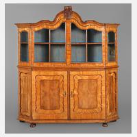 2. Hälfte 18. Jh., Nussbaum und Nussbaummaser auf Nadelholz furniert, Einlegearbeiten in Zwetschge und Ahorn, zweiteiliger Korpus, das Unterteil als Viertelzylinder mit zwei Türen, Aufsatz in verglaster Pyramidenform, mit drei feststehenden Einlegeböden, alt restauriert, Alters- und Gebrauchsspuren, Maße 253 x 125 x 81 cm.