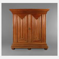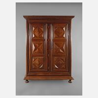 Frankreich, um 1780, Nussbaum massiv, zerlegbarer zweitüriger Schrank mit stark reliefierten Prismen als Kassettenfüllungen, Front mit umlaufendem Profilrahmen und kassettiertem Mittelsteg, Gesims mit Zahnleiste, originales Schloss, Schlüssel und Beschläge, Einlegeböden fehlen, Maße 232 x 170 x 68 cm.