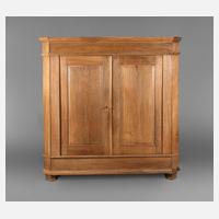 Eiche massiv, Mitte 18. Jh., komplett zerlegbarer zweitüriger Dielenschrank mit weit ausladendem Profilgesims, stark profilierte Lisenen und Türfüllungen, originales Schloss, Schlüssel (schließt schwergängig) und Beschlag, innen später teilweise mit Sperrholz verkleidet, Alters- und Gebrauchsspuren, etwas rest.bed., Maße 204 x 204 x 77 cm.