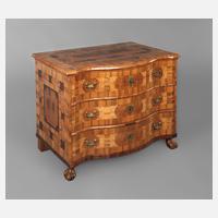 Nussbaummaser und verschiedene Wurzelhölzer auf Nadelholz furniert, dreischübiger Korpus mit stark gebauchter Front, allseitig mit geometrischen Einlegearbeiten verziert, Rechteckreserven gesäumt von breiten Ornamentbändern, die Vorderfüße in Form von Adlerklauen auf Kugeln, die hinteren Füße erneuert, originale Schlösser und Beschläge, mit Schlüssel, alt restauriert, Maße 78 x 100 x 66 cm.