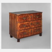 2. Hälfte 18. Jh., Nussbaummaser auf Nadelholz furniert, dreischübiger Korpus mit leicht gebauchter Front, allseitig verziert mit eingelegten Bändern, Schlösser fehlen, restaurierungsbedürftig, H 81 x B 97 x T 57 cm.