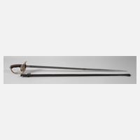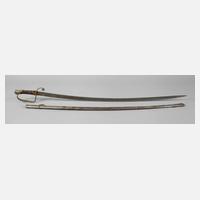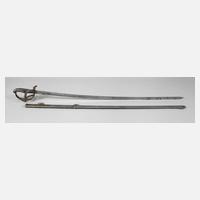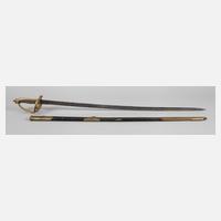 Messingkorb mit zwei Spangen, belederter Griff mit Wicklung erneuert, 27 mm breite Klinge mit beidseitiger Kehlung, auf der Fehlschärfe gemarkt "AMES MFG Co. Chicopee Mass./U.S. ADK 1862", Eisenscheide mit Schlepper und zwei beweglichen Trageringen, altersgemäße Erhaltung, L ges. ca. 107 cm.