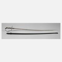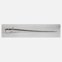 um 1900, ohne Hersteller, Eisenbügelgefäß, Haihautgriff, Wicklung fehlt, leicht gekrümmte Eisenscheide mit Schlepper, zwei bewegliche Trageringe, sichtbare Altersspuren, L ges. ca. 99 cm.