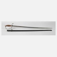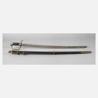 vernickeltes Gefäß mit zwei Klappscharnieren, brauner Kunststoffgriff, die gerade Klinge allseitig zur Hälfte mit militärischer Ätzung, Herstellerpunze Waage ohne Zeichen, schwarz lackierte Eisenscheide mit festem Tragering, gute Erhaltung, L ges. ca. 101 cm.